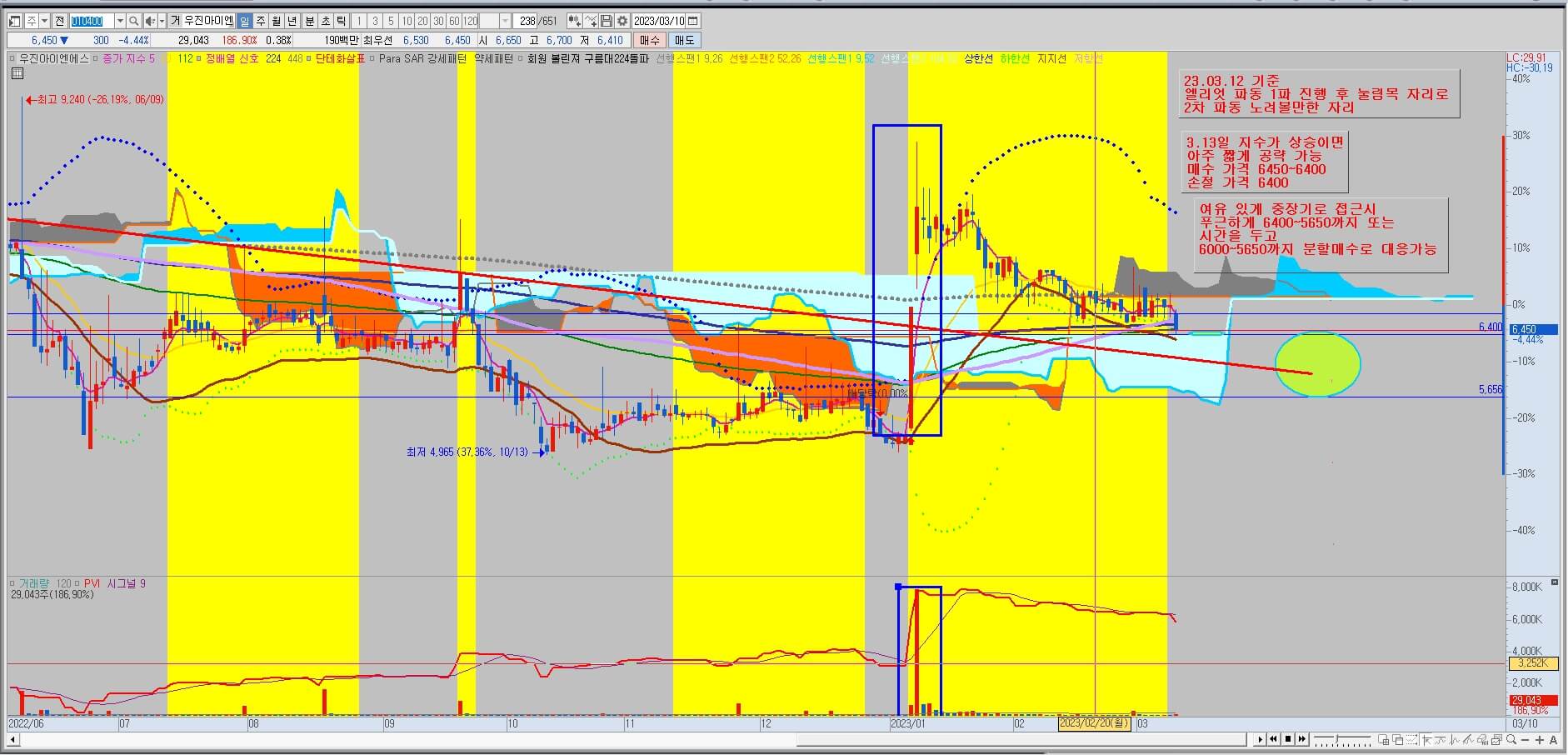 차트를 장기적으로 보았을 때 밥그릇 2번 구간에 해당이 되며 23년 1월 6일 신고거래량을 갱신하며 큰 폭으로 상승을 했고 현재 주가는 눌림목 자리에 있습니다. 이번 상승으로 8,700원의 가격대에 있는 매물들은 많이 흡수를 했습니다. 거래량을 보시면 매물 흡수 여부를 알 수 있습니다. 단기적으로 보나 장기적으로 보나 지금 현재의 자리는 엘리엇 파동 중 1파 눌림목이라 판단 됩니다. 업황의 매리트는 좋지 않지만 순수하게 차트만 보았을때 상승의 힘이 강하다고 보입니다. 매수 가격은 6,400~5,650원이며, 손절가격은 5,650입니다. 현재 매수가격 안에 있지만 지수의 압박으로 더 하락할 여지가 있기 때문에 최대한 분할매수로 손절가 부근에서 모아가시면 좋을 것 같습니다. 어느 정도 시간투자를 생각하시고 접근하는 게 마음이 편안할 것입니다.