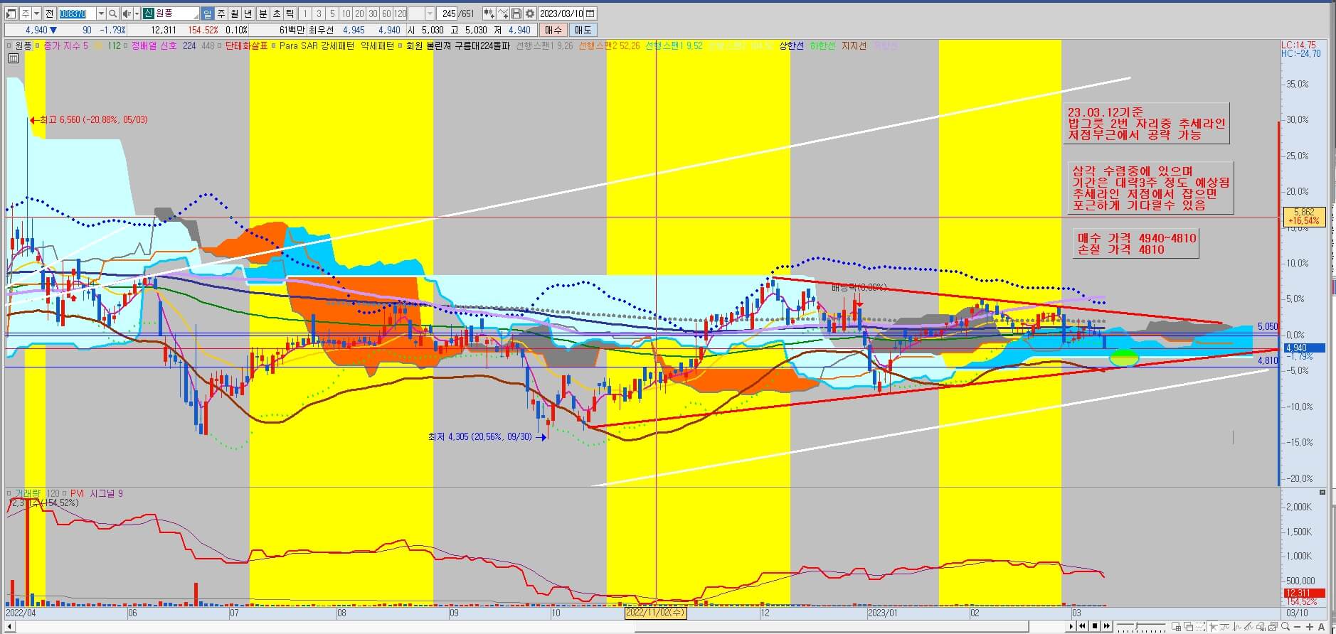 장기적으로 차트를 길게 봤을 때 꾸준히 우상향을 그리며 좋은 흐름을 보이고 있습니다. 단기적으로 보면 21년도에 신고가를 만들고 현재는 주가가 많이 빠져 큰 추세라인의 저점 부근에 위치해 있습니다. 밥그릇 패턴으로 본다면 아직 2번에 속하며 작은 삼각수렴을 만들어 가고 있습니다. 오늘 주가가 작은 추세의 지지라인을 이탈했다가 빠르게 회복을 하면서 하락보다는 상승의 의지를 보여주고 있습니다. 수렴의 기간은 아직 남아있지만 타점의 저점부근입니다. 매수가격은 4,940~4,810원이며 손절가격은 4,810원입니다. 지수의 큰 변동이 없다면 오늘 종가상 손절가 이탈을 하지 않는다면 수익의 가능성이 높아 보입니다.
