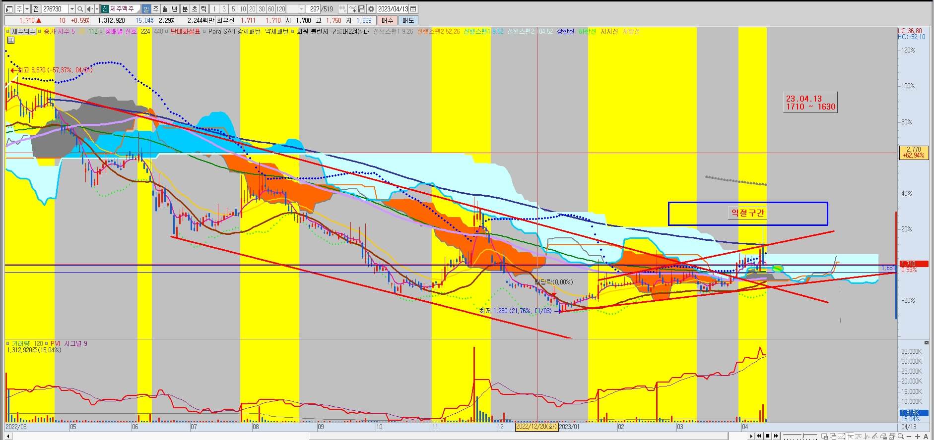 하락박스 추세를 벗어나 우상향 추세를 만들고 있습니다. 중간중간 매집봉을 만들면서 서서히 우상향 중이기 때문에 공략이 가능해 보이네요. 기준봉매매법을 이용해서 공략이 가능하며 기준봉 저점도 112일선과 유사하므로 상승의 확률이 조금 더 높아 보입니다. 매수가격은 1,710~ 1,630원입니다.