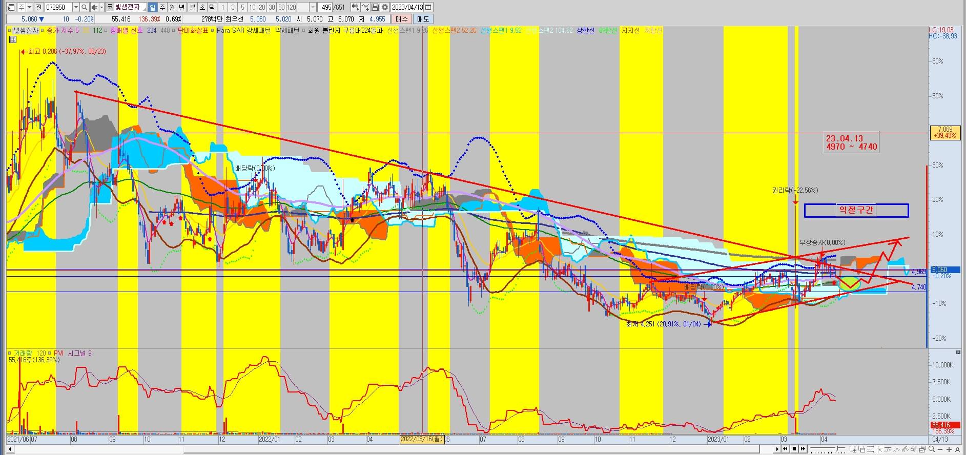 큰 추세의 삼각수렴에서는 벗어나지 못했지만 작은 추세에서는 1번 종목과 똑같이 우상향 박스권을 만들어 가고 있습니다. 저점 추세라인 부근에서 공략이 가능할 거 같네요. 매수타점은 4,970~4,740원입니다. 분할 매수로 대응하시면 됩니다.