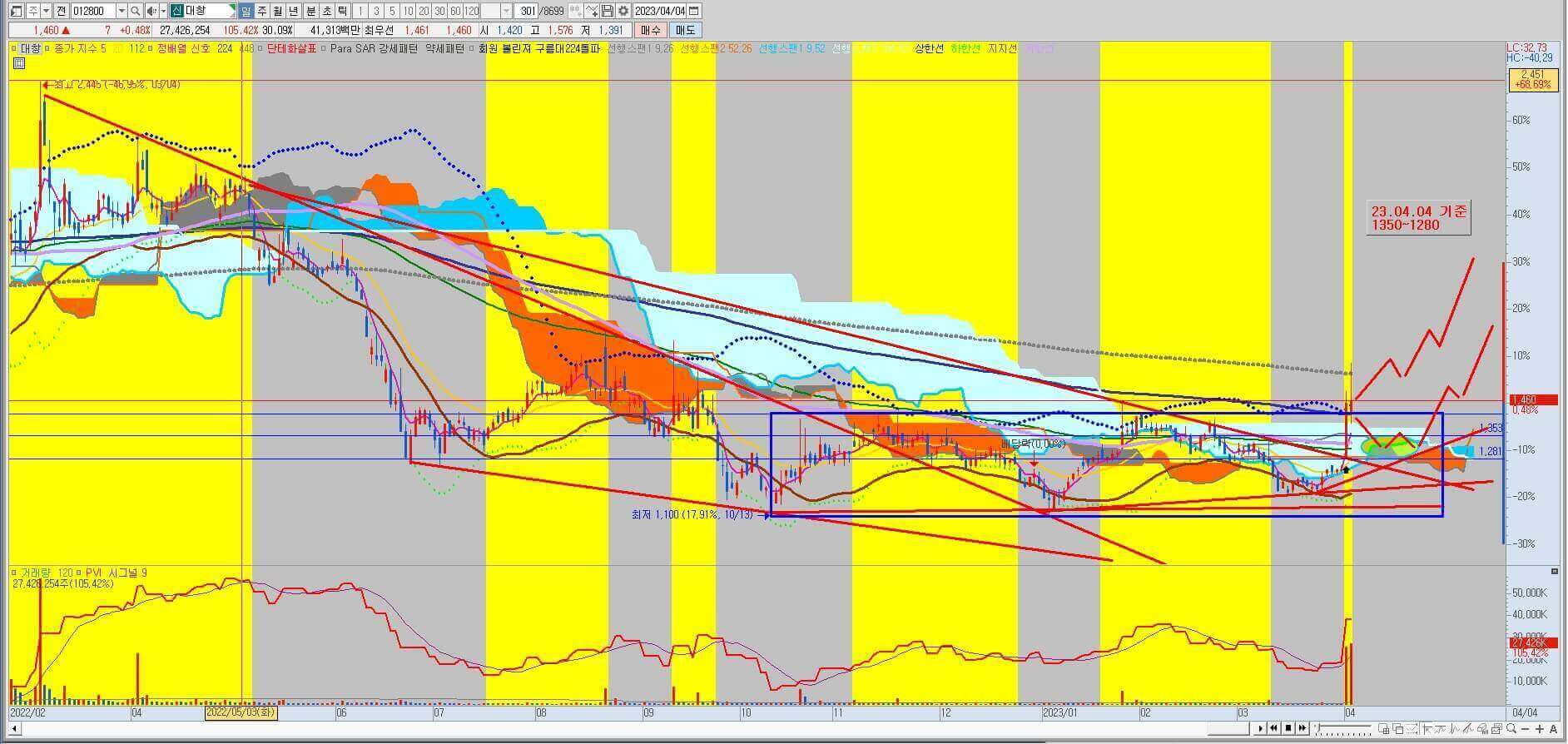 큰 거래량을 2 거래일 연속 만들면서 하락구간과 박스권 돌파에 성공을 했습니다. 돌파를 했기 때문에 박스권 매물도 어느 정도 소화 했다고 볼 수 있겠네요. 448일선 저항을 받고 밀리는 듯했으나 크게 하락하지 않고 224일선을 지켜주고 있습니다. 상승 각도가 좋기 때문에 바로 상승을 이어 갈지 아니면 눌렸다 갈지는 알 수 없지만 일단은 좋은 기준봉이 나왔습니다. 그래서 기준봉 매매 방법으로 대응이 가능할 것으로 보입니다. 매수가격은 1,350~1,280원입니다. 추격보다는 기다렸다 타점에서 매수한다면 더 좋은 결과가 있을 거 같네요.