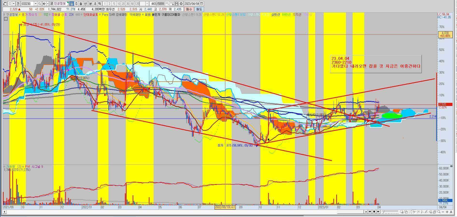오늘 기준으로 우상향 박스의 중앙에 주가가 있기 때문에 매수하기가 좀 어중간하다고 판단됩니다. 그래서 며칠 기다렸다 추세의 저점부근에서 공략을 하면 매우 좋을 거 같네요. 매수가격은 2,360~2,210원입니다.