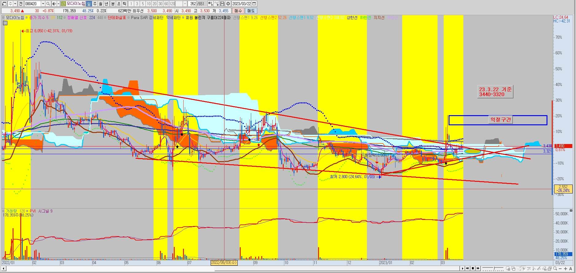 하락추세에서 많은 거래량을 동반하여 112,224,448일선 돌파하여 추세를 상승으로 돌렸습니다. 눌림 구간에서 112선강력하게 지켜주면서 주가가 소폭 상승하여 224일선 부근에서 지지를 받고 있습니다. 강력한 지지라인인 112일선을 기준으로 잡고 공략이 가능할 것으로 보입니다. 매수가격은 3440~3320원이며, 손절가격은 3320원입니다.