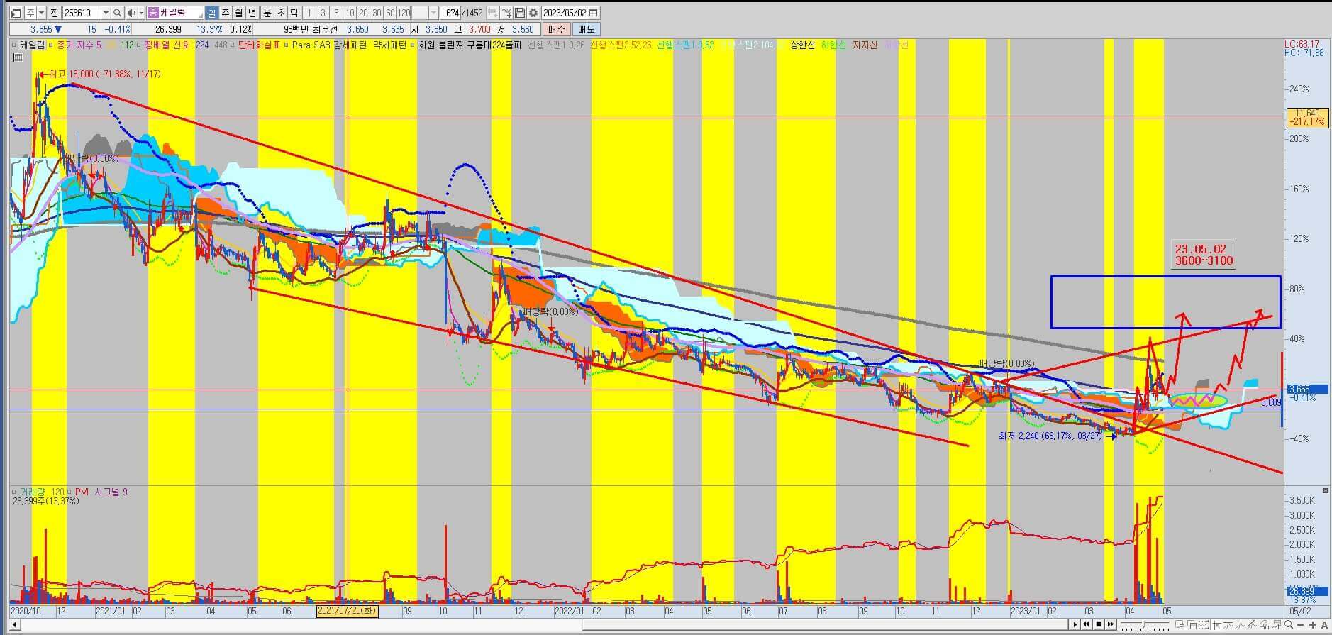 하락 추세에서 엘리엇파동 중 2파를 만들면서 추세를 돌렸습니다. 거래량을 많이 터트리며 올라왔기 때문에 진짜 엘리엇파동으로 보입니다. "N"자형으로 바로 3파가 나올 수도 있고, 눌렸다가 3파가 나올 수도 있습니다. 바로 3파가 나온다에 배팅을 한다면 224일선을 손절로 잡으셔야 하고 매수 가격으로 3,640~3,520원으로 대응하면 되겠습니다. 눌렸다가 상승할 거다에 배팅할 경우 3,500~3,100원까지 천천히 분할 매수로 평단 조절하면서 매집하면 되겠네요. 평단은 최대한 3,300~3,250원 정도로 만든다면 손익비가 좋은 타점이라 생각됩니다.