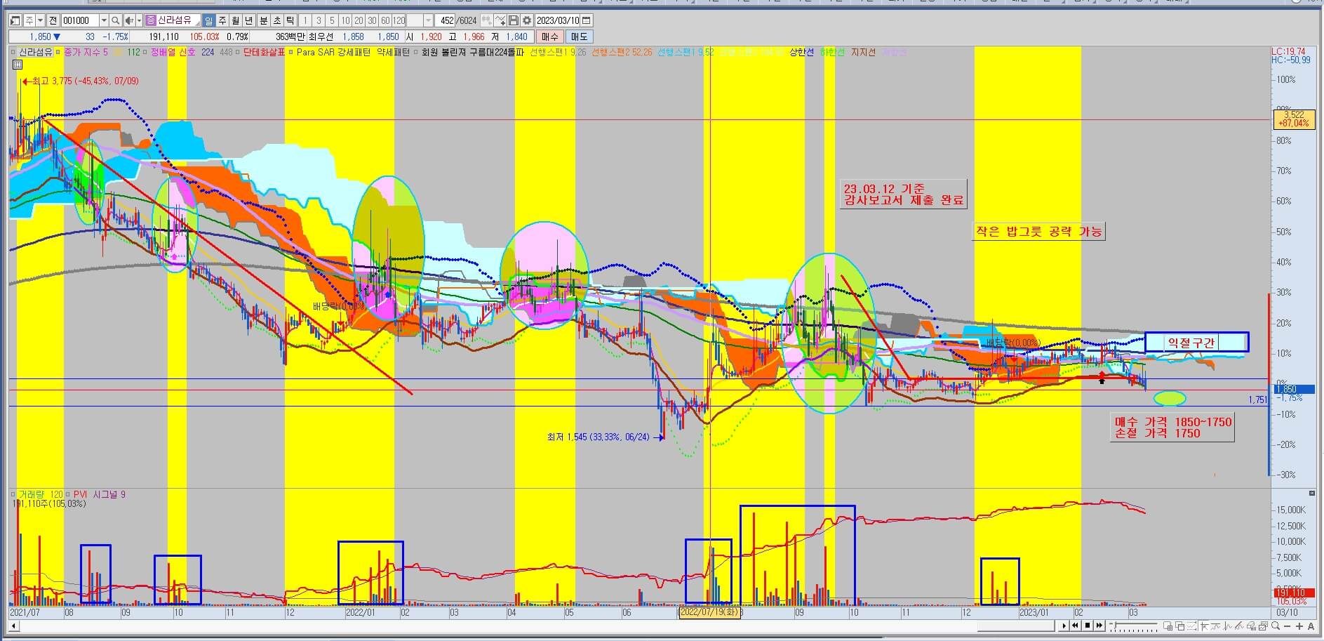 바닥권에서 공구리를 잘 만들고 큰 거래량으로 112, 224, 448일선을 순차적으로 단기간에 돌파 시도를 했으며 추세 전환을 하였습니다. 돌파 과정에서 큰 변동폭의 매물을 소화했고 현재는 힘이 빠져서 쉬어가는 눌림목 자리로 보입니다. 단기적으로 엔자형 상승을 기대해 볼 수 있습니다. 큰 폭은 아니지만 약 18%의 수익구간이 보입니다. 매수가격은 2,350~2,220원이며 손절가는 2,220원입니다. 익절은 448일선 부근입니다. 매집기간도 짧고 매도저항도 강하기 때문에 단기스윙으로 큰 수익을 노리기보다는 짧게 치고 빠치는 전략으로 대응하면 좋을 것 같습니다.