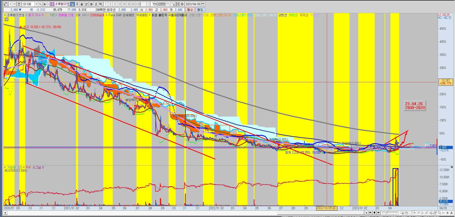 하락, 행보를 하면서 신고거래량을 만들면서 저점 구간에서 물량 매집을 하고 있습니다. 매집과 동시에 고점과 저점이 높아지는 우상향 추세를 만들어가고 있습니다. 현재 주가는 우상향 추세의 저점에 있기 때문에 손절은 짧고 익절은 큰 손익비가 아주 좋은 종목입니다. 오늘내일 매수해서 추세를 이탈하면 바로 손절로 대응하고 추세를 유지한다면 우상향 박스권의 고점까지 노리고 공략하시면 될 거 같습니다. 매수가격은 2,850~2,800원입니다.