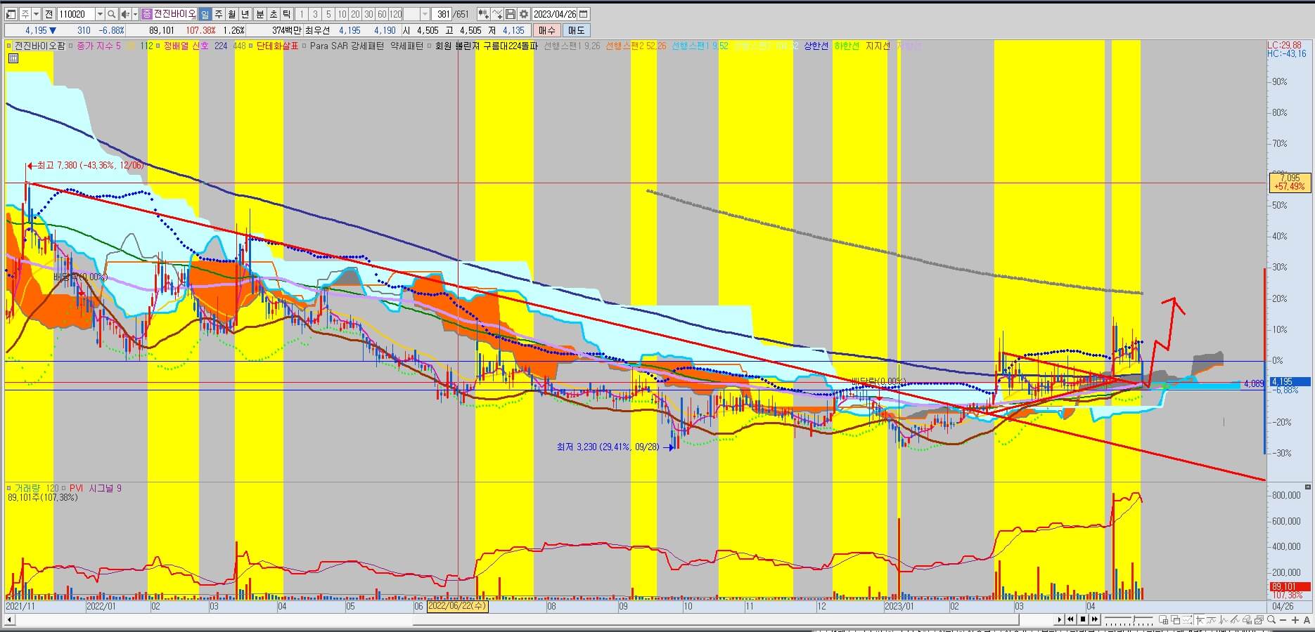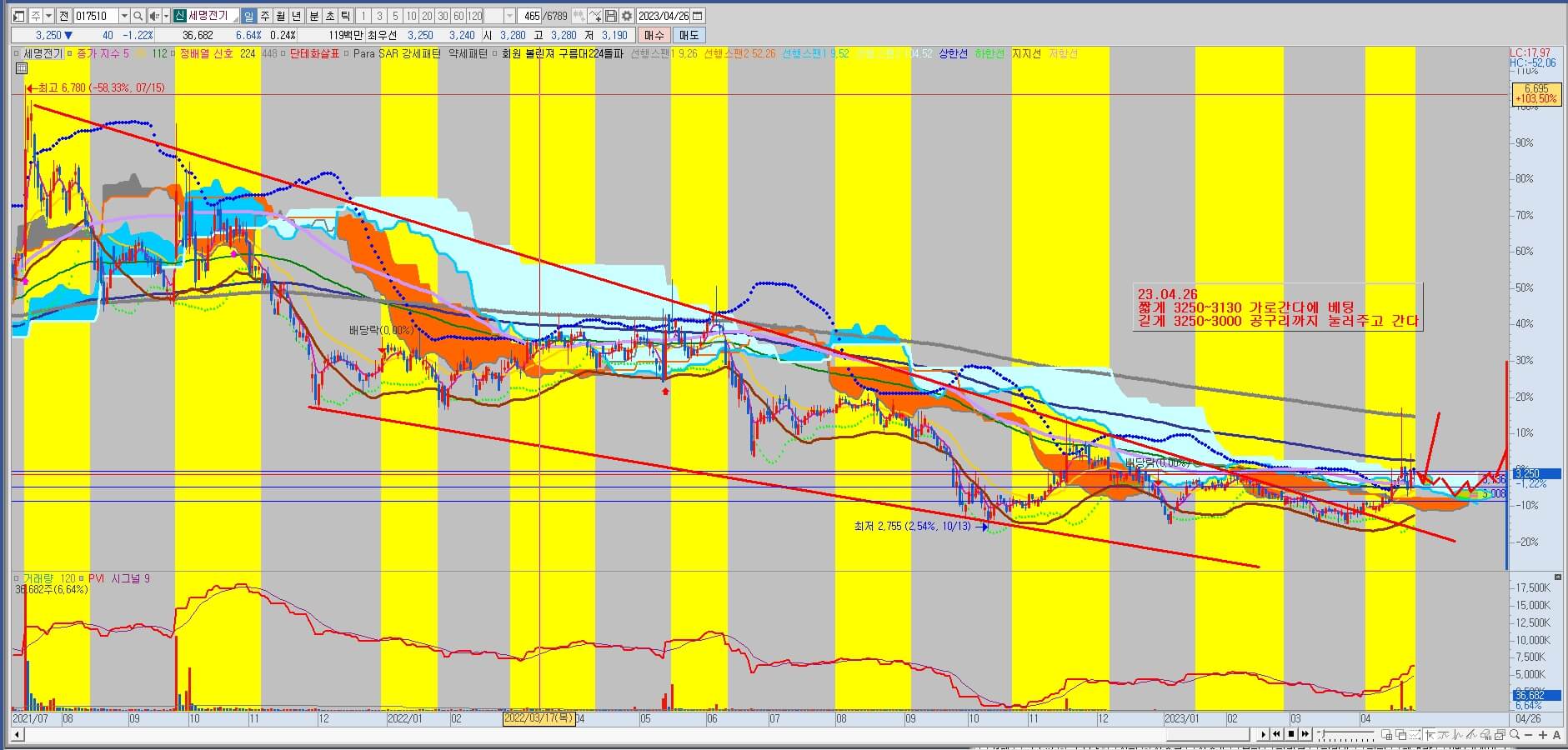 하락 박스권추세에서 큰 거래량을 동반하여 448일선까지 찌르는 매집봉을 만들고 조정을 보이고 있습니다. 이 종목은 타점이 2가지가 있는데 하나는 112일선 손절 잡고 단기적으로 하는 매매와 손절을 작은 공구리 라인까지 길게 잡고 하는 매매가 있습니다. 첫 번째 방법은 112일선 지지하고 바로 반등을 노리고 하는 매매입니다. 앞서 설명한 것과 동일하게 바로 반등을 노리는 것이기 때문에 매매기간은 짧게 가져가야 되겠지요. 매수가격은 3,250~3,130원입니다.