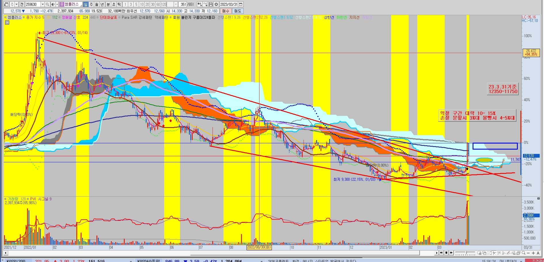 신고가에서 거래량 없이 주가가 하락을 하였기에 아직까지 세력이 있다고 판단이 됩니다. 하락 추세를 이어가다 52주 신고거래량을 만들면서 상한가를 가면서 추세를 돌리는데 성공을 했습니다. 예전에도 이야기했지만 세력이 아니면 만들 수 없는 상한가가 나왔기 때문에 개미 털기가 나올 것으로 예상되며 기간도 빠르면 1주일 정도로 보입니다. 차분히 기다렸다가 콘크리트라인과 112일선 지지라인에서 공략을 해보면 좋을 거 같네요. 매수가격은 12,350~11,750원이며, 손절은 11,750원입니다. 익절 구간은 대략 10 ~ 15% 정도 나오고 매수가 몰빵 하면 손절은 4~5% 대고 분할 대응하시면 3% 안쪽으로 나오네요. 참고하셔서 좋은 결과 있으면 좋겠습니다.