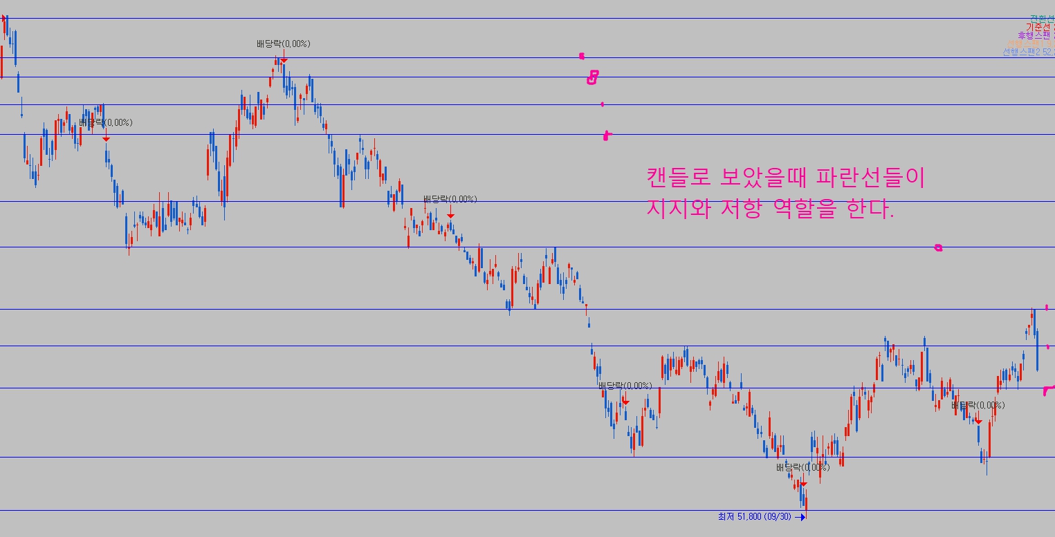 주가가 선 밑에 있으면 저항으로 작용을 하고, 선 위에 있으면 지지의 역할을 합니다. 수평선에 부딪치는 캔들이