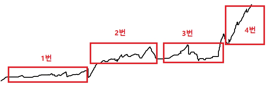 1번 구간은 평범한 흐름의 주가를 유지합니다. 아직 세력이 없는 구간입니다.