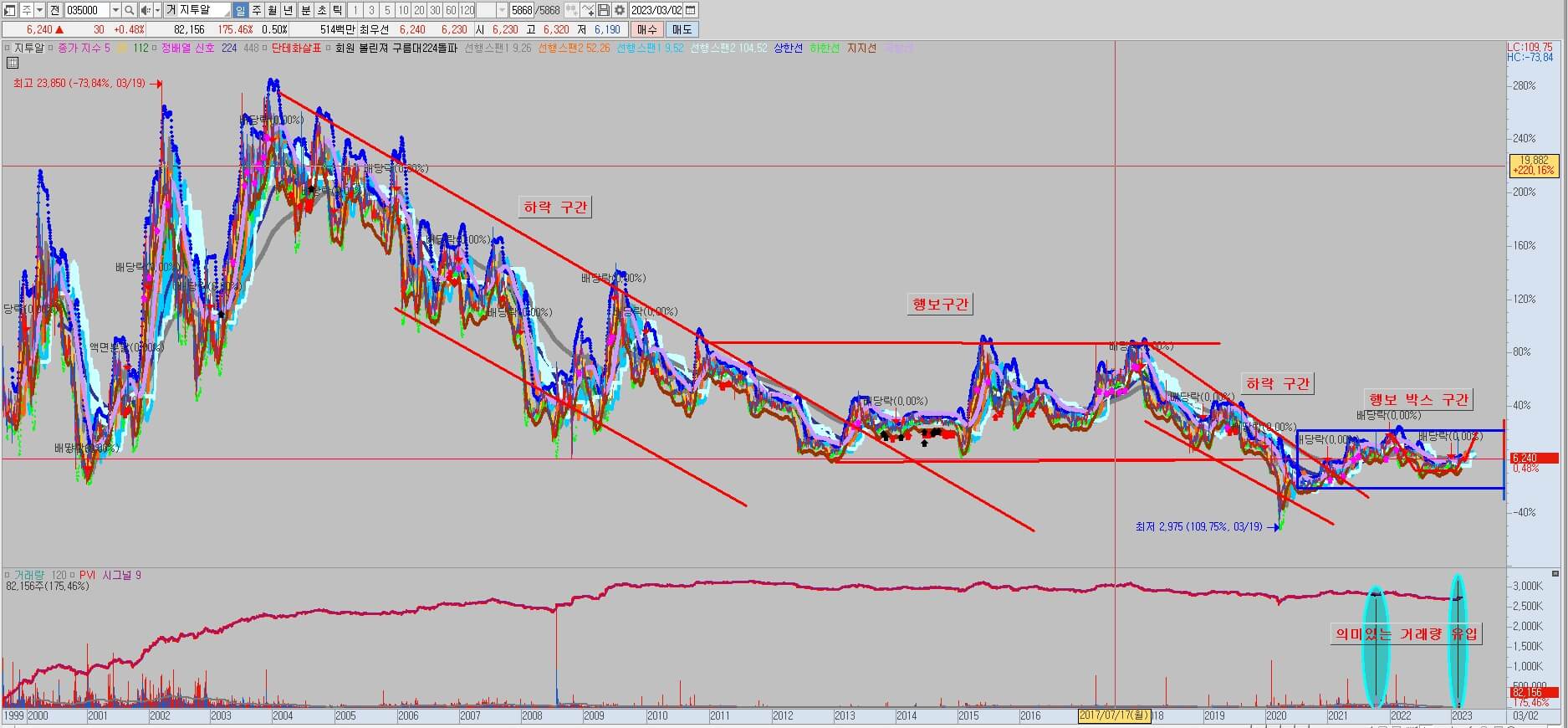 매출액, 매출총이익은 전년동기 소폭 감소했고 영업이익과 당기순이익은 조금 큰 폭으로 감소를 했습니다. 자산 중에서 유동자산, 비유동자산 또한 감소를 하고 있습니다. 하지만 부채는 줄어들고 있으며 자본 중에서 지배기업주주지분이 증가하고 있습니다. PER은 5.95, PBR 0.61, 배당수익률 5.64%이며 최대주주비율은 35%로 안정적이다 볼 수 있습니다. 세력이 개입하기 딱 좋은 주주비율이네요. 재무상으론 조금 불안해 보이지만 재무제표는 현재의 주가에 영향을 주지 않습니다. 여기서 중요한 것은 장기이평을 어떠한 형태로 뚫었다는 것 입니다. 장기이평을 뚫었다는 것은 세력이 개입을 했고 주가를 올리겠다는 의미로도 해석이 가능합니다. 112,224일 이평선을 깨지 않고 지지를 해준다면 다시 한번 상승을 노려 볼 수 있습니다. 단기적으로 이평선 지지 시 밥그릇 3번 자리로 보입니다.