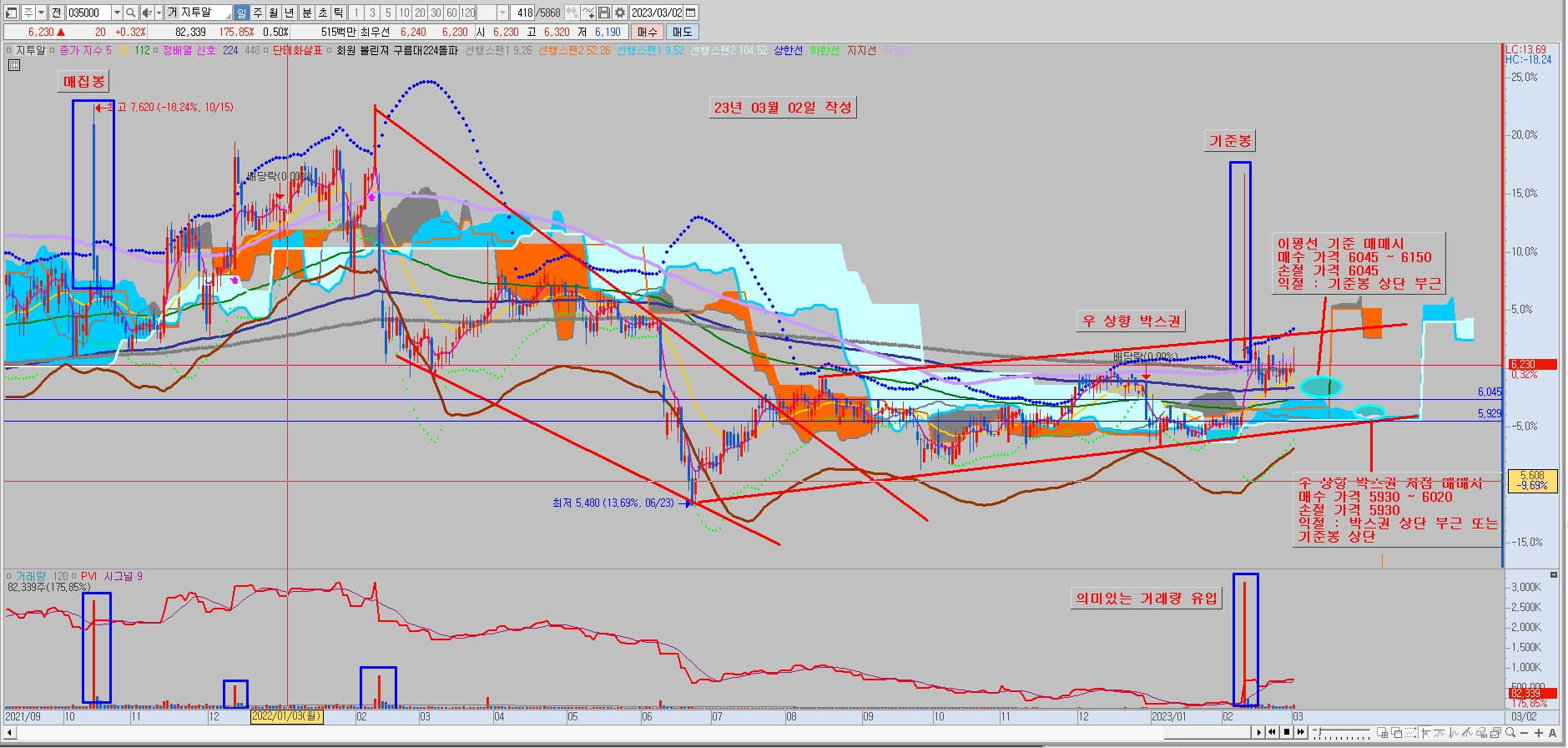 오늘 기준으로 주가를 봤을 때 큰 하락 없이 이 구간에서 버터주는 흐름이 나온다면 대략 1~2주 안에 112일선이 224일선을 돌파하는 골든크로스가 나올 확률이 높으며 이때 다시 한번 시세가 날 수 있습니다. 매수 가격은 6,045~6,150원이고 손절가격은 6,045입니다. 익절가격은 기준봉 윗 꼬리 상단 부근으로 잡고 대응하시면 될 것 같습니다. 두 번째는 박스권 하단 추세선을 기준으로 잡고 상단 부근이나 그 이상에서 매도를 하는 박스권매매 방법이 있습니다. 매수 가격은 5,930 ~ 6,020원이고 손절가격은 5,930원입니다. 익절은 박스권 상단부근 혹은 조금 더 길게 보실거면 기준봉 윗꼬리 상단부까지 잡고 대응하시면 됩니다. 두 가지 방법 중 조금더 효율적인 매매 방법은 첫번째 방법인거 같습니다. 시간이나 금전적으로 여유가 있다면 두가지 방법을 다 이용해서 공략이 가능한 것으로 보입니다.