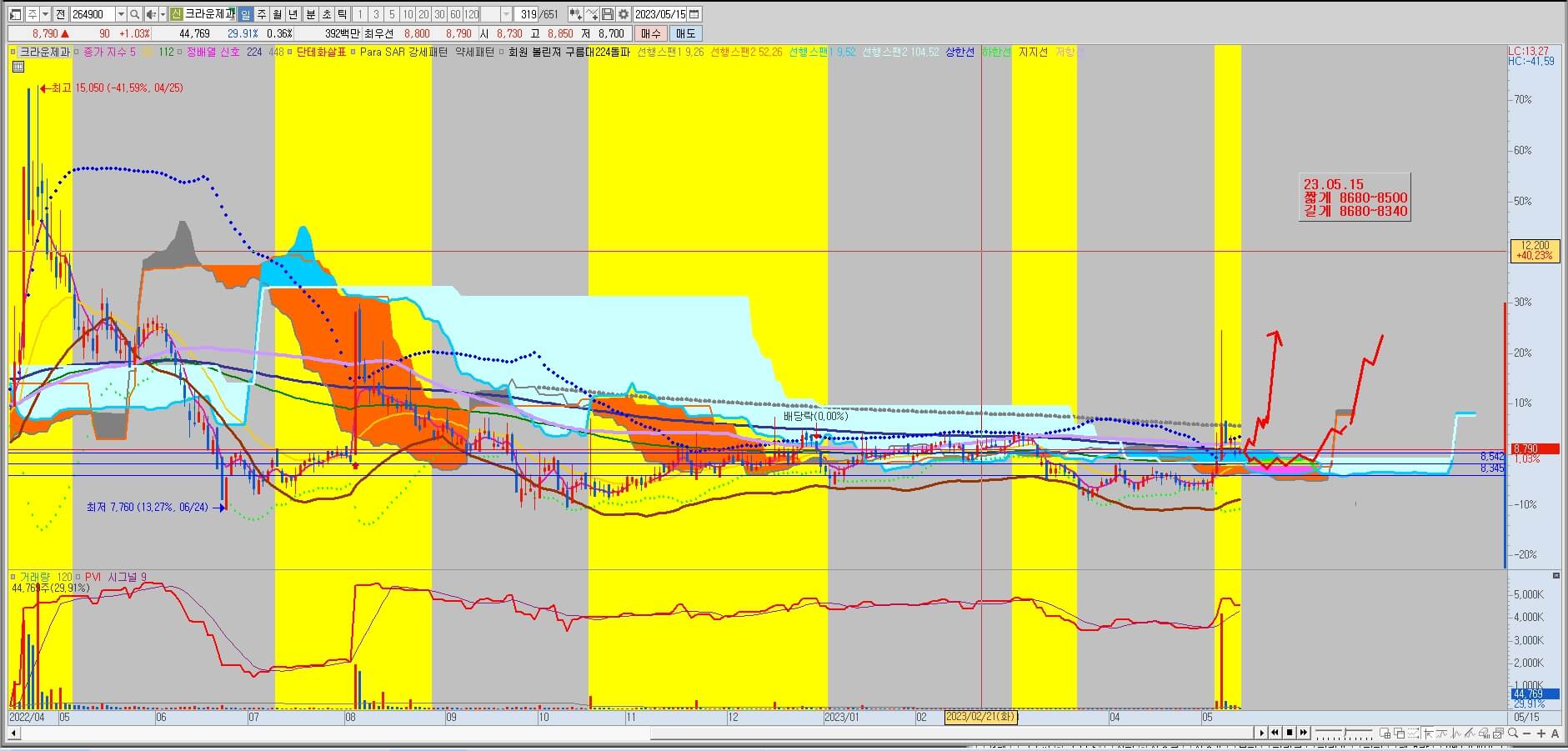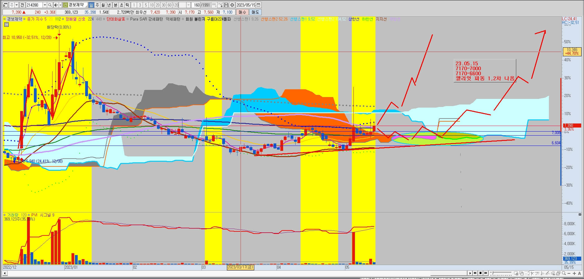 거래량이 많이 발생한 시기에 얼리엇파동 중 1,2파가 나오고 눌러주는 흐름을 보이다가 다시 상승의 전조증상이 나왔습니다. 앞으로 얼리엇파동 3,4파를 기대해 볼 수 있기 때문에 공략 가능합니다. 매수 가격을 7,170~7,000원으로 짧게 잡고 "112일선에서 반등한다"에 배팅하는 방법과 7,170~6,600원으로 추세 저점까지 여유를 가지고 공략하는 방법이 있습니다. 이 역시 지수의 변동성을 생각해서 충분히 기다렸다 공략하는 게 좋아 보입니다.
