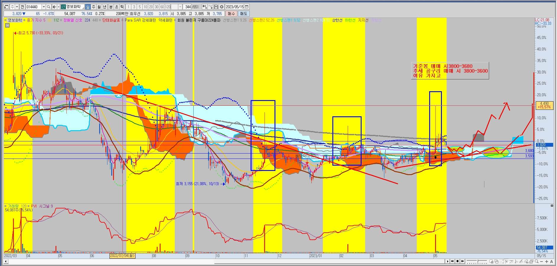 공략방법은 기준봉매매와 추세 공구리 매매가 있습니다. 기준봉 매매 시 매수가격은 3,800~3,680원으로 손절 가격을 112일선으로 잡고 공략하는 방법입니다. 추세 공구리 매매 시 3,800~3,600원으로 혹시나 나올 단순 개미 털기까지 생각해서 손절 가격을 조금 더 여유 있게 잡은 것으로 "추세만 이탈하지 않으면 상승한다"에 배팅한 공략법입니다.