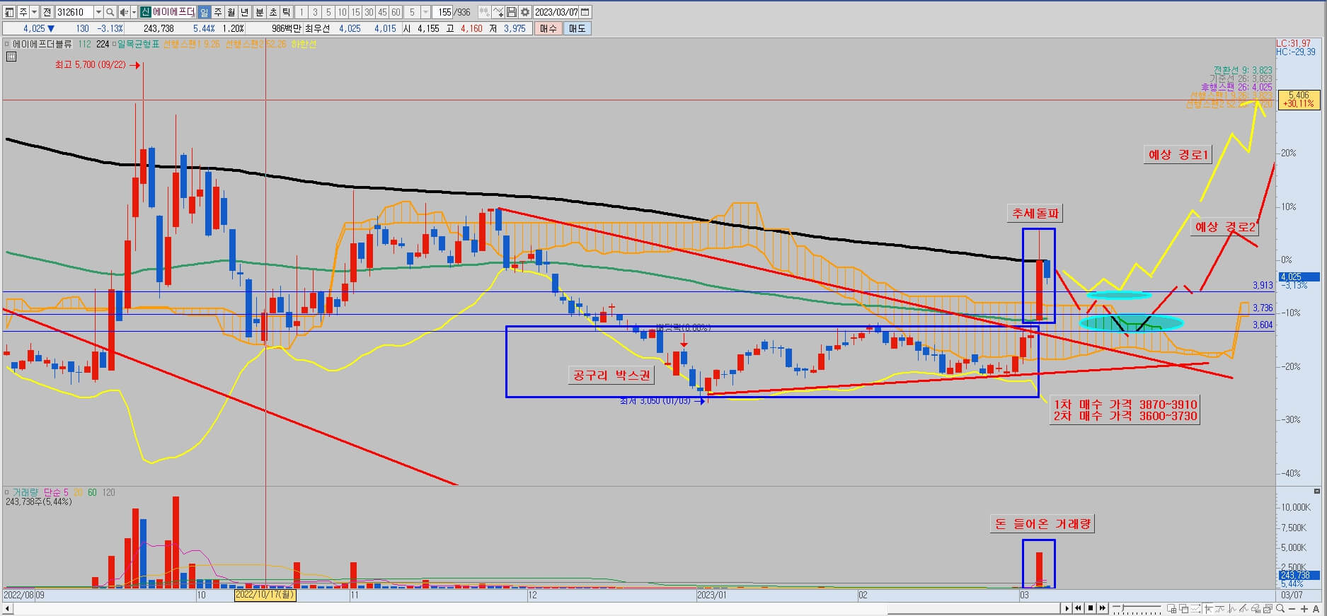 차트를 장기적으로 봤을 때 오랜 기간 하락을 하여 가격과 기간 조정을 하였고 22년도 9월에 특정 기간 동안 활발한 평소와 다른 거래량으로 차트를 돌리려는 시도를 했습니다. 상승 추세의 전환은 아직 되지 않았지만 밥그릇 패턴 중 하락구간인 1번은 지난 것 같습니다. 2번 구간의 초입으로 보이고 박스권 매매도 가능하다고 판단됩니다. 박스권 저점과 고점도 대략 40% 정도 되기 때문에 변동성이 상당히 크다고 여겨집니다. 차트를 보면 하락, 돌파, 다시 하락, 다시 한번 더 돌파가 나왔고 어제 112일선을 돌파했고 오늘은 224일선 부근에서 지지를 잘해주는 흐름을 보이고 있습니다. 112, 224일선 안에서 지지를 해준다면 행보 박스권에서 우상향 박스로 전환 가능성도 높아 보입니다. 어제 출현한 기준봉을 이용하여 공략이 가능합니다. 공구리도 단단하고 올라가는 힘도 좋기 때문에 기준봉 시가까지 시세가 안 올 수 도 있습니다. 그래서 중심부터 시초가까지 2 혹은 3 분할을 하면 좋을 것 같습니다. 기준봉 매매 시 매수 가격은 3,660 ~ 3,890원입니다. 손절 가격은 3,660원입니다. 익절은 단기적으로 448일선 부근입니다. 기법은 이평 때리기입니다. 박스권 매매도 가능은 하지만 박스권 저점부근의 지지라인이 거의 없으므로 손절을 아주 짧게 잡고 대응을 해야 할 것 같습니다. 매수 가격은 3,400 ~ 3,340원입니다. 익절은 박스권 상단 부근입니다.
